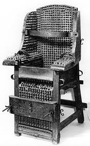 3. Cadeira, uma cadeira coberta por pregos na qual a vítima era obrigada a sentar-se despida. Além de cintos de couro pressionava a vítima contra os pregos intensificando o sofrimento e também se colocava brasas na parte inferior para queimar a vítima.